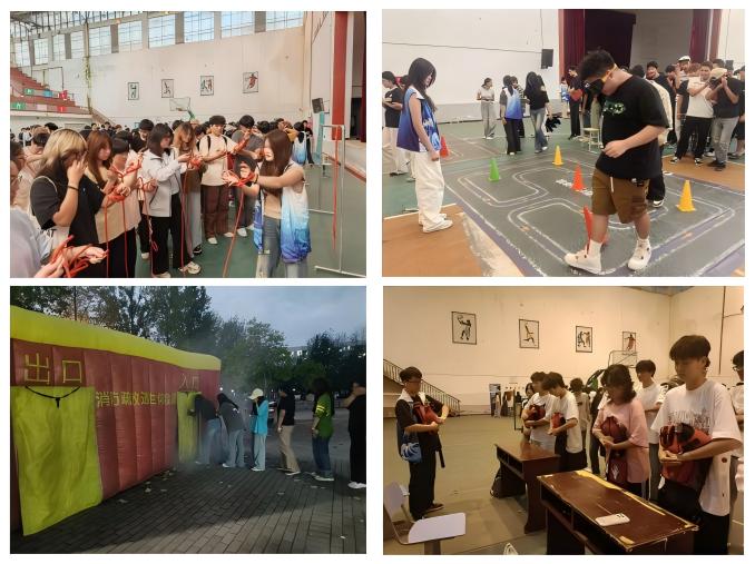 本次活动紧密围绕“识险、避险、自救、互救”的安全教育主线,精心设置了六大实操实训项目:灭火实训通过模拟真实火场,指导学生掌握不同灭火器的正确使用方法;结绳训练传授多种应急救援绳结技巧;海姆立克急救教学让学生掌握气道异物梗阻的急救技能;烟雾逃生训练模拟真实火场环境,训练学生低姿前行、湿毛巾捂口鼻等规范逃生动作;超感教室体验运用VR技术,让学生在沉浸式场景中增强风险感知能力;醉酒行走体验则通过特殊模拟装置,让学生切身感受酒后身体失控状态,强化交通安全意识。